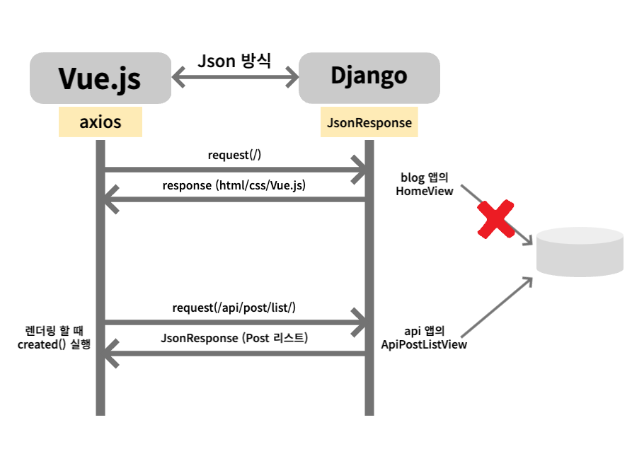 현재 프로젝트에서 home url(/)에 접근했을 때의 Vue-Django 연동 처리 과정이다.